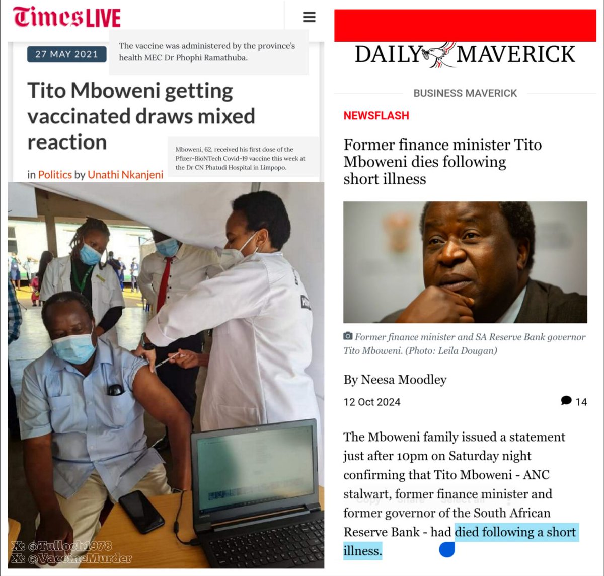 Limpopo Health MEC Dr Phophi Ramathuba had the honour of administering the Pfizer Covid-19 Vaccine to Finance Minister Tito Mboweni. Sudden Death of Tito Mboweni, Former Finance Minister & Former Governor of South African Reserve Bank following a "short illness" #diedsuddenly