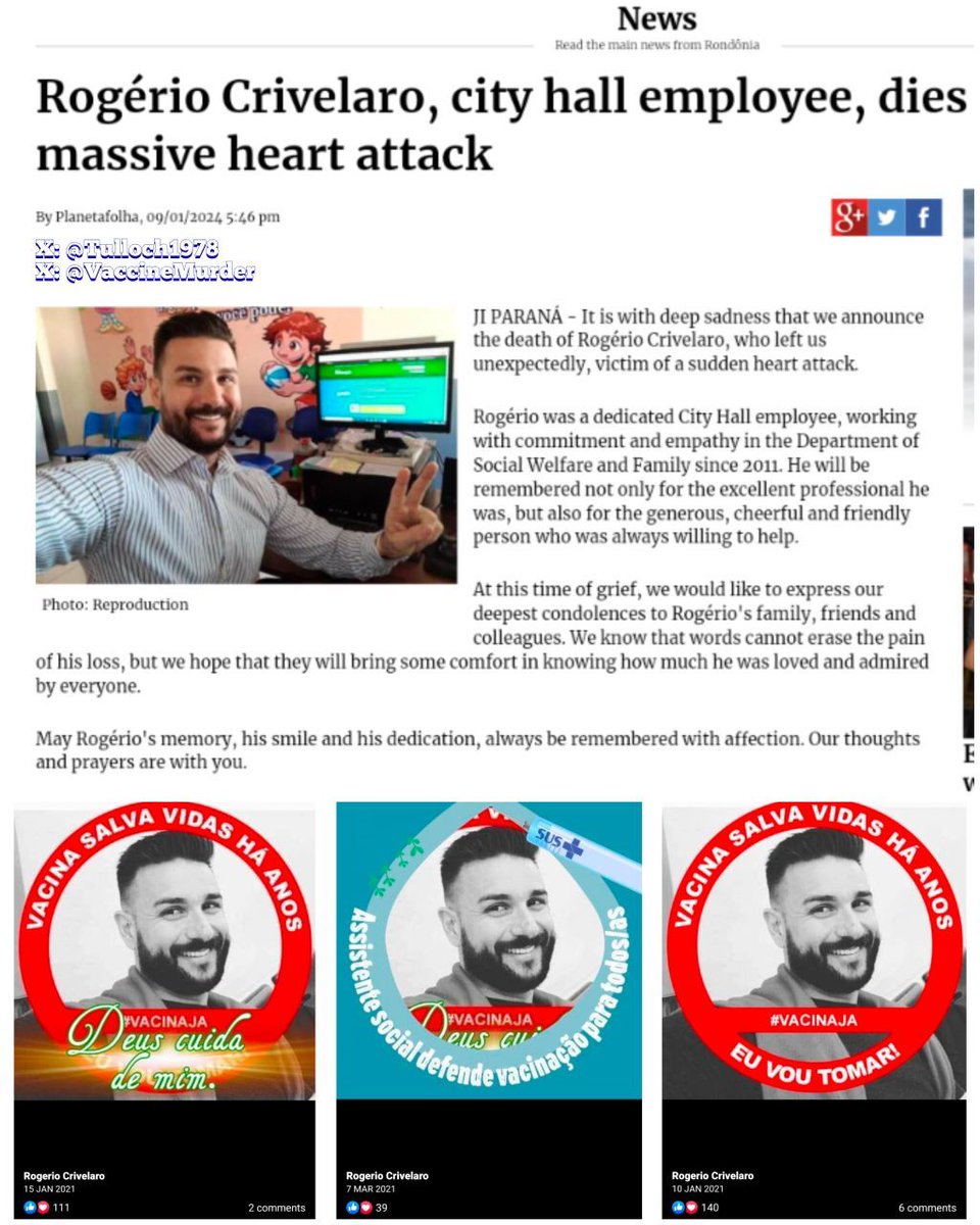 "Vaccine has been saving lives for years - get vaccinated! #diedsuddenly Rogério Crivelaro, city hall employee died unexpectedly from a massive heart attack.