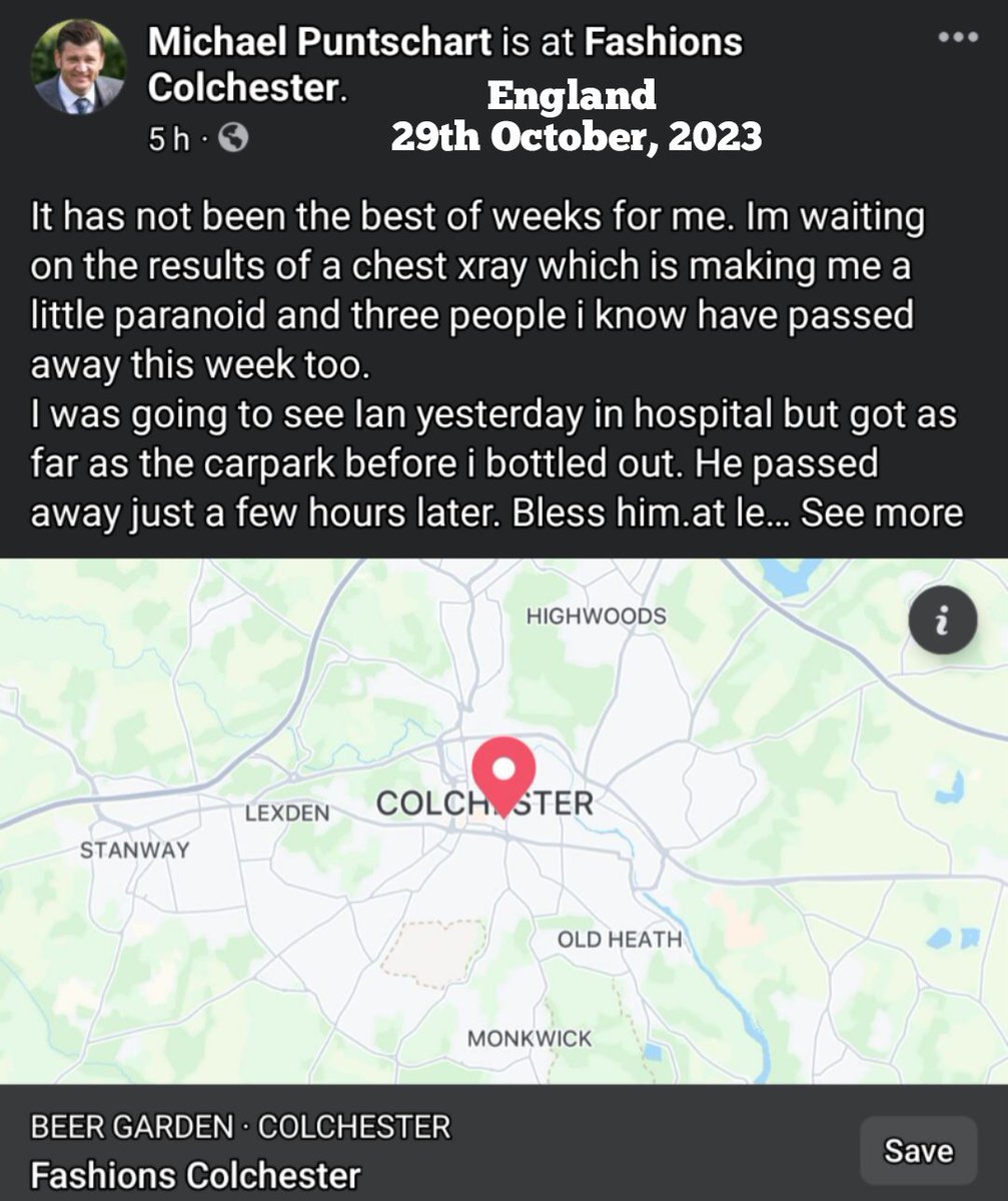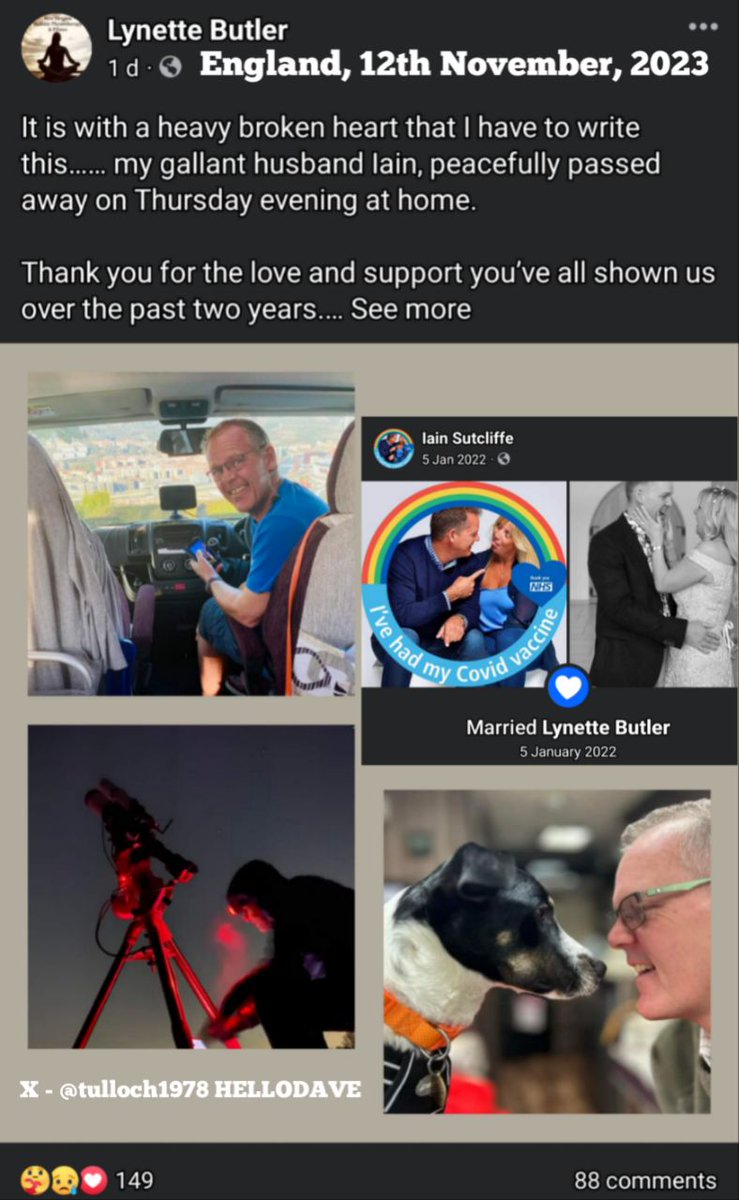 England, Iain Sutcliffe. #diedsuddenly #NHS #astrazeneca “I was diagnosed with a rare cancer just before Xmas 2021.” Received #Pfizer June 2021 "Heavy broken heart that I have to write this. My gallant husband Iain, peacefully passed away. 12/11/2023" https://fundraise.cancerresearchuk.org/page/faith-hope-and-charity-deep-sky-astrophotography-from-white-waltham-airfield?d=60fa0ac5-7765-4459-865f-01e61f4cc39f&fbclid=IwAR22mJSTNfxvmC8RZbS-AzGWwAda1-XGsDanuyXKWH0MuLU4SBVTv7FKflc