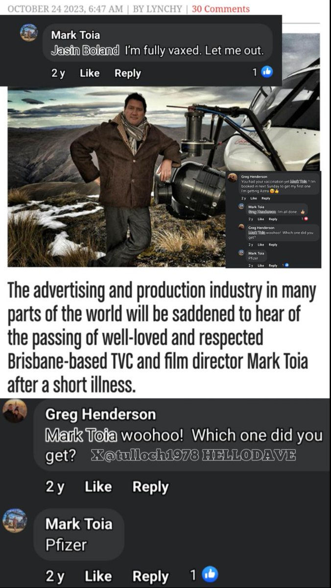 Australia, Mark Toia, filmmaker, director, and photographer, 51-year-old #diedsuddenly (Oct 2023) “I'm fully vaxxed. Let me out” Died after a ”brief illness" #Pfizer https://campaignbrief.com/vale-much-loved-tvc-and-film-director-mark-toia-this-giant-of-a-man-had-the-softest-heart-ever/