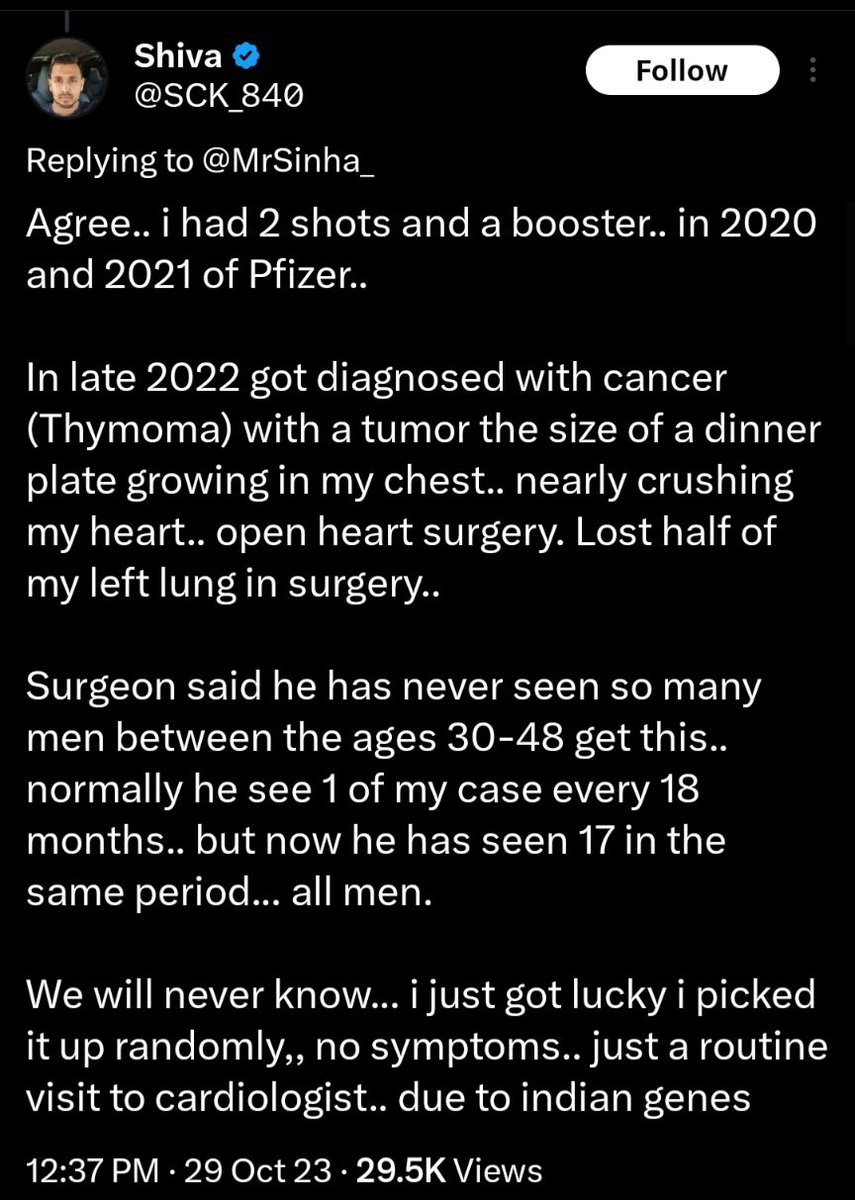 “I had 2 shots and a booster.. in 2020 and 2021 of #Pfizer.. In late 2022 got diagnosed with cancer (Thymoma) with a tumor the size of a dinner plate growing in my chest.. nearly crushing my heart.. open heart surgery. Lost half of my left lung in surgery.. https://t.co/AMEz65vgTT