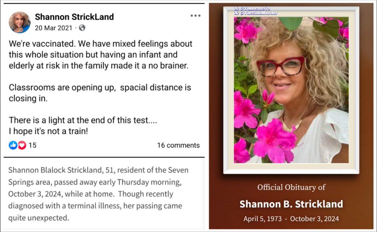 "We're Vaccinated" #diedsuddenly Shannon Strickland, 51, died October 3, 2024, while at home. "Though recently diagnosed with a terminal illness, her passing came quite unexpected."
