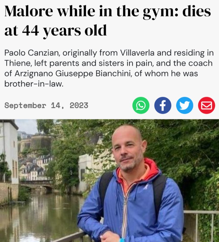 Italy, Paolo Canzian. 44 year old died suddenly two days after being caught by the sudden illness in the gym. https://www.ilgiornaledivicenza.it/territorio-vicentino/thiene/malore-in-palestra-muore-paolo-canzian-1.10274308 #suddendeath #diedsuddenly