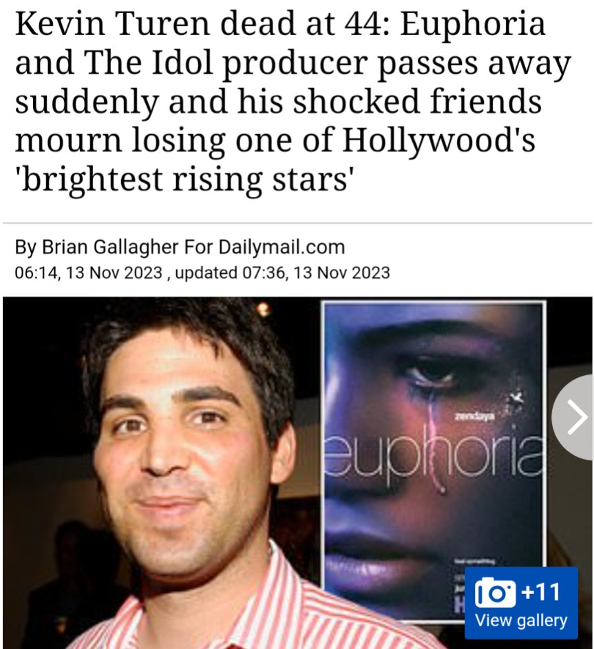 Kevin Turen Dead at 44: Euphoria and The Idol producer died suddenly. No cause of death. https://www.dailymail.co.uk/tvshowbiz/article-12742091/Kevin-Turen-dead-44-Euphoria-Idol-producer-passes-away-suddenly-shocked-friends-mourn-losing-one-Hollywoods-brightest-rising-stars.html?fbclid=IwAR34Zkh6GeiK7gRlCNhBxJLEquuj8gXarO-vaAWUQB2lA4QuDrRcaUKJL0k