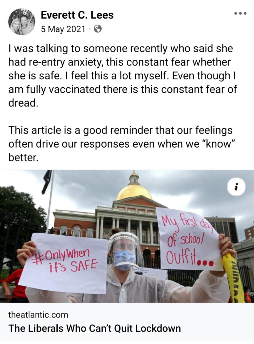"The Liberals Who Can’t Quit Lockdown." "I was talking to someone recently who said she had re-entry anxiety, this constant fear whether she is safe. I feel this a lot myself. Even though I am fully vaccinated there is this constant fear of dread." https://www.theatlantic.com/politics/archive/2021/05/liberals-covid-19-science-denial-lockdown/618780/?fbclid=IwY2xjawFZOwZleHRuA2FlbQIxMQABHe4RW6Hq5GUfmC57o_eqz5q_d9r-fqY0IHFZcdB2anhAALG6s3d1zszbUA_aem_MS7HQGtjw4SXpzY8Njcx9Q&sfnsn=scwspmo
