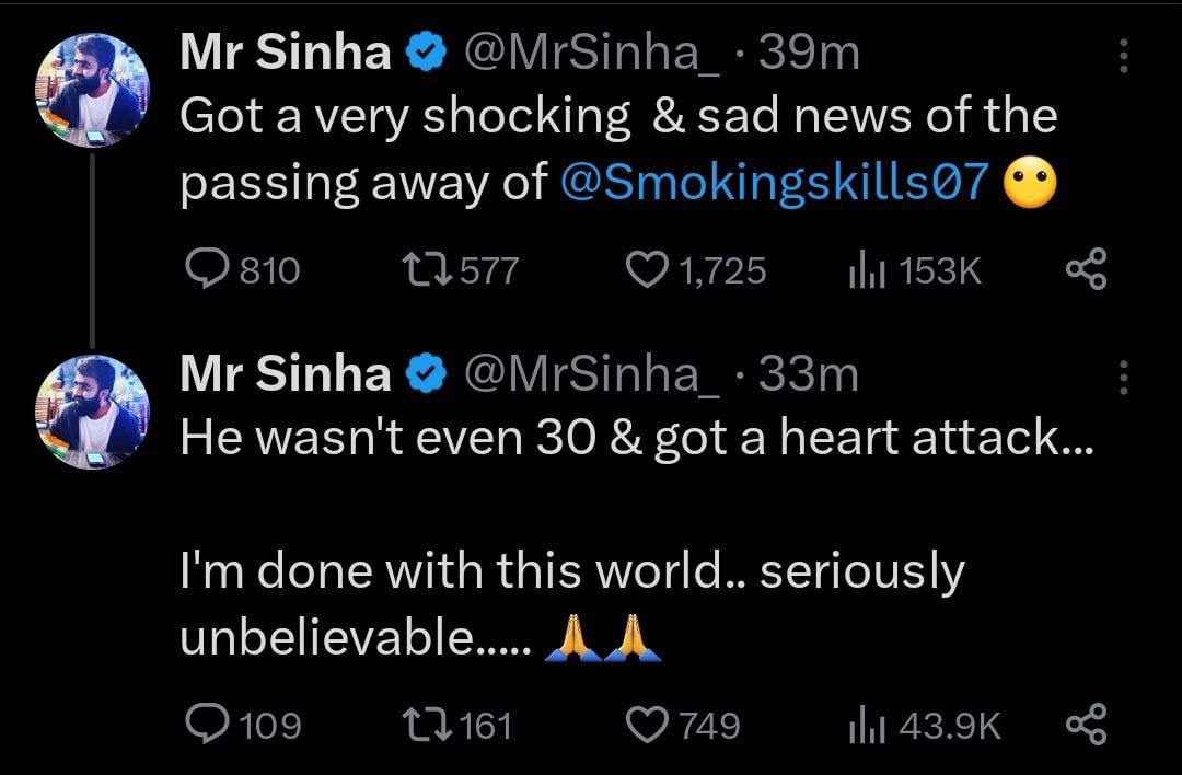 Fully Vaccinated Troll #DiedSuddenly ”Got very shocking & sad news of the passing away of @Smokingskills07 😶 He wasn't even 30 & got a heart attack... I'm done with this world.. seriously unbelievable..... 🙏🙏” #VaccineGenocide https://t.co/O89aMnsSbD