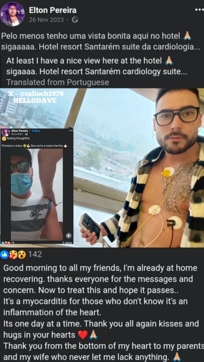 Portugal, Singer, Elton Pereira. "I Got Vaccinated" @Pfizer "Nice view from the cardiology suite" "Now to treat this and hope it passes. It's myocarditis, inflammation of the heart." https://t.co/U8Yfu0r9nK