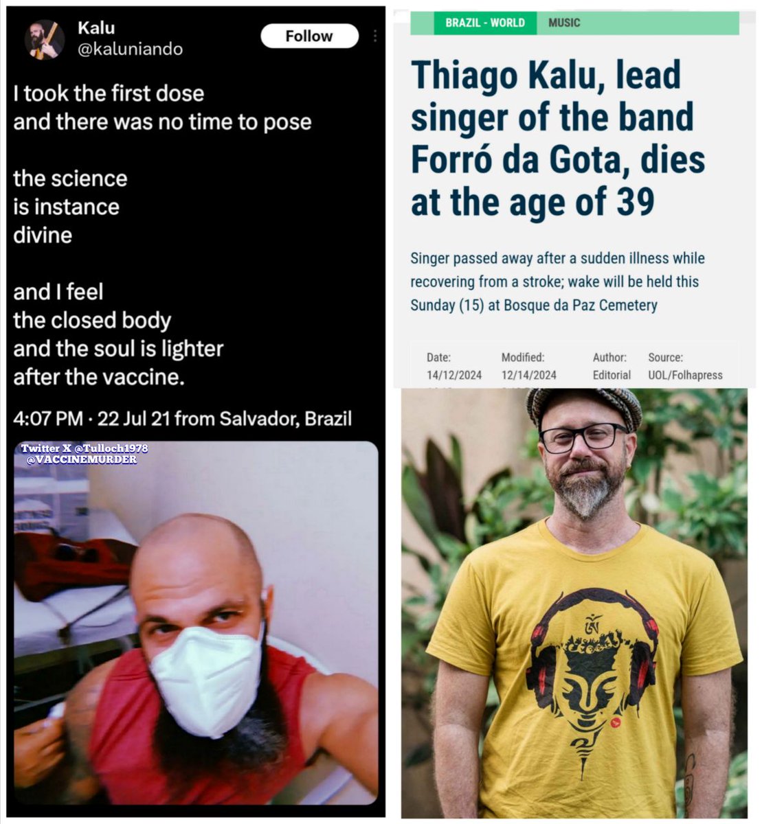 "I took the first dose & there was no time to pose." #diedsuddenly Thiago Kalu, Lead Singer of the Band Forró da Gota, Dead at 39. The singer suffered a "sudden illness" after recently being hospitalized following an ischemic stroke.
