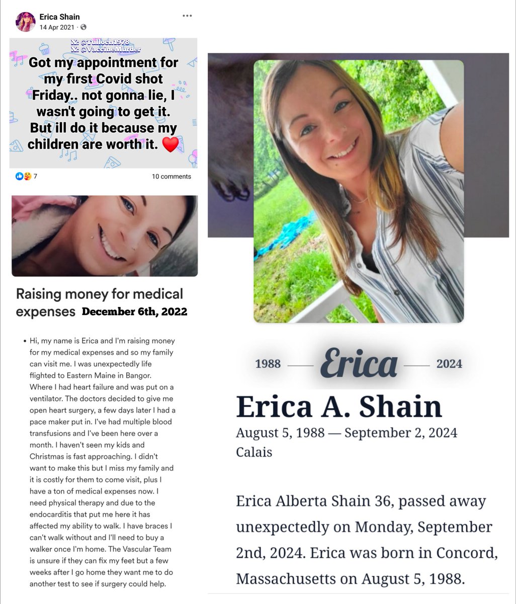 "Got my appointment for my first Covid shot." (2021) #diedsuddenly "I was unexpectedly life flighted. I had heart failure and was put on a ventilator. Doctors decided to give me open heart surgery" (Dec 2022) Erica Shain 36, passed away unexpectedly Sept 2nd, 2024.