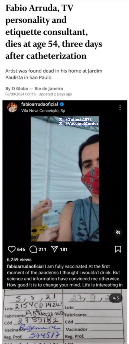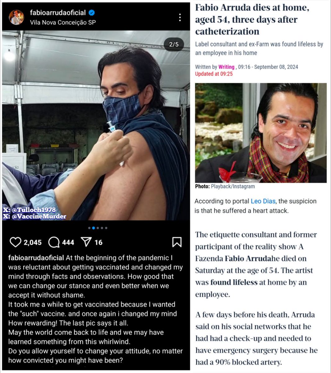 "I was reluctant about getting vaccinated and changed my mind through facts and observations." TV Presenter, Fabio Arruda (54) found dead by his maid - suspected heart attack. #diedsuddenly A few days before his death he underwent emergency surgery from a 90% blocked artery.