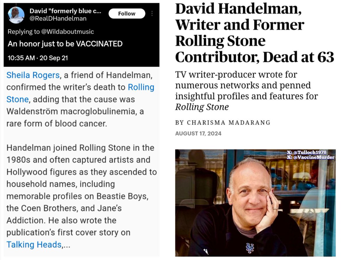 David Handelman, Writer and Former Rolling Stone Contributor, Dead at 63 "An honor just to be VACCINATED" Cause of death was Waldenström Macroglobulinemia, a rare form of blood cancer #diedsuddenly #turbocancer