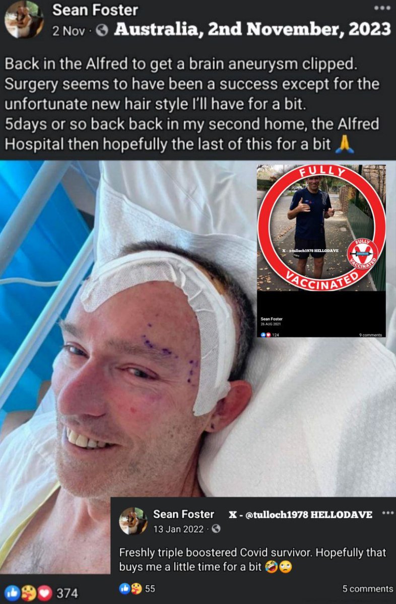 Australia, Sean Foster. Brain Aneurysm #Pfizer Another happy customer.. “Freshly Triple Boostered” “Back in the Alfred to get a brain aneurysm clipped. Surgery seemsto have been a success except for the unfortunate new hair style I’ll have for a bit.” https://t.co/wuyHWSzt2c