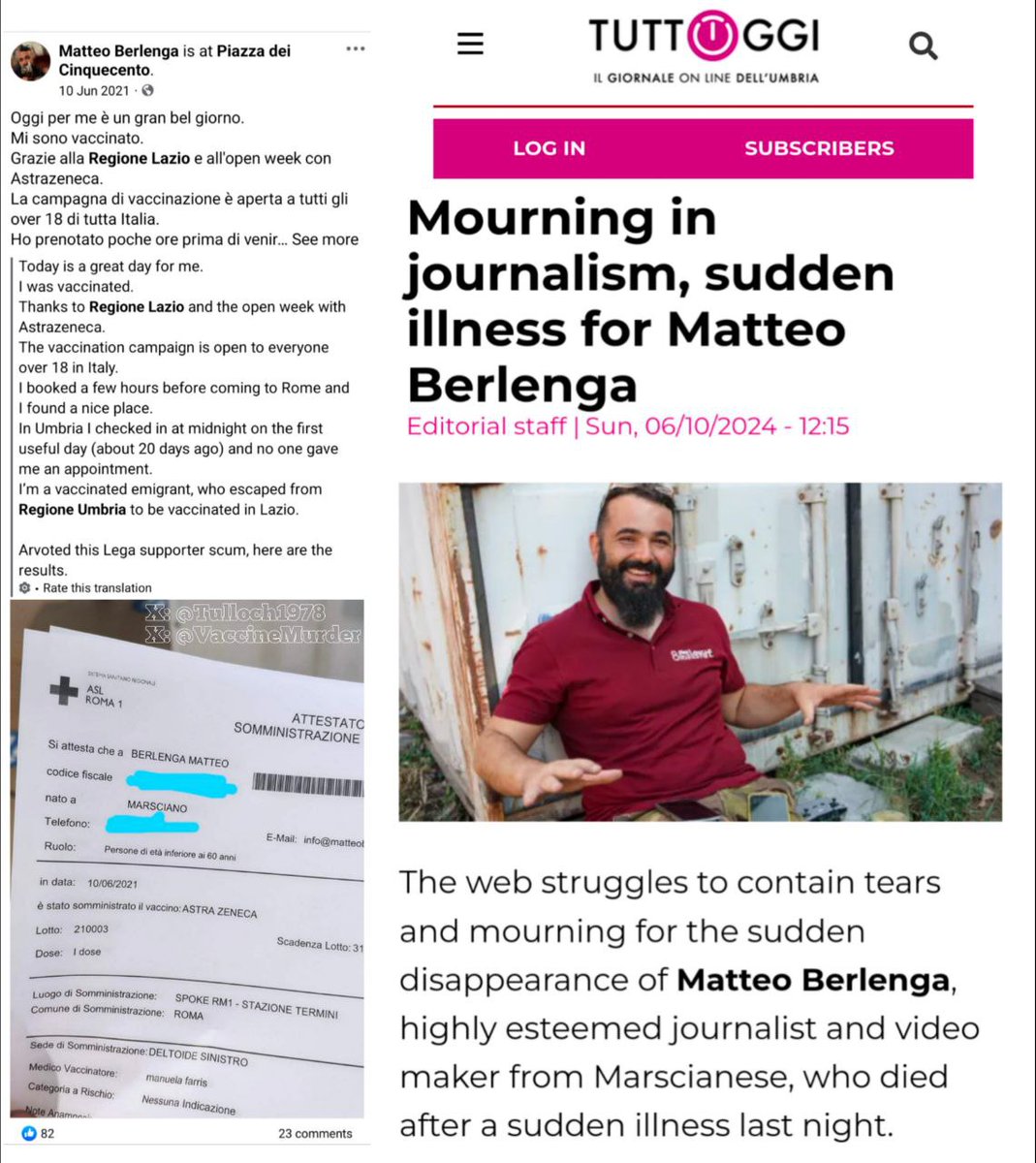"I'm a vaccinated emigrant, who escaped Regione Umbria to be vaccinated - thanks to AstraZeneca" #diedsuddenly Sudden Death of Matteo Berlenga, the highly esteemed journalist & video maker has died suddenly following a "sudden illness" in the night.