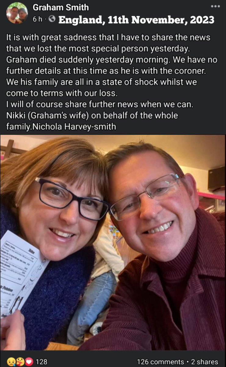England, Graham Smith. #diedsuddenly (Nov 2023) “I've had 3 jabs mate” #Pfizer “Graham died suddenly yesterday morning. We have no further details at this time as he is with the coroner. We his family are all in a state of shock.” #astrazeneca #nhs #suddendeath https://t.co/ENfmJFqZMD