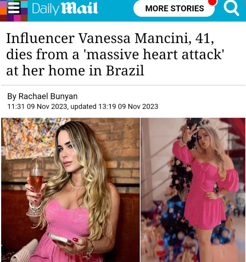 Brazil, Influencer, Vanessa Mancini #diedsuddenly (November 2023) Massive Heart Attack #Pfizer The 41 year old, was in her luxury condo in the northwestern city of Manaus with her parents when she suddenly collapsed. https://www.dailymail.co.uk/news/article-12729617/Influencer-Vanessa-Mancini-41-dies-massive-heart-attack-putting-Christmas-decorations-home-Brazil.html