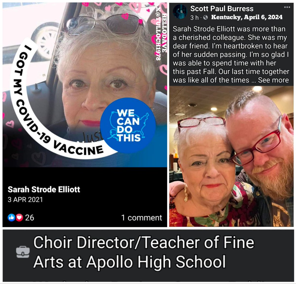 Kentucky, Choir Director/Teacher of Fine Arts at Apollo High School, Died Suddenly. (April 2024) "I Got My COVID-19 Vaccine" "Sarah Strode Elliott was more than a cherished colleague. She was my dear friend. I’m heartbroken to hear of her sudden passing." https://t.co/m5YfczYmxw