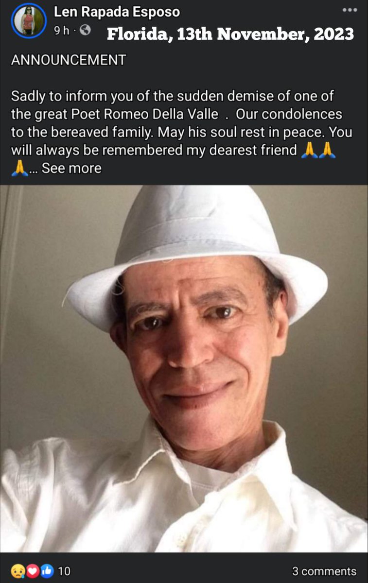 Florida, Romeo Della Valle. #diedsuddenly (Nov 2023) “Sadly to inform you of the sudden demise of one of the great Poet Romeo Della Valle. Our condolences to the bereaved family. May his soul rest in peace.” #astrazeneca #pfizer #clotshot https://t.co/1g9UOpGOx6