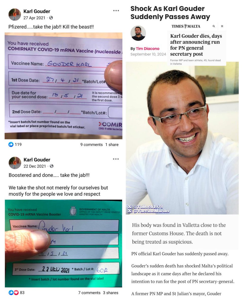 "Pfizered. take the jab! Kill the beast! Boostered & done #diedsuddenly Former MP Karl Gouder, found dead at 45. His body was found in Valletta. The death is not being treated as suspicious. "Gouder’s sudden death has shocked Malta’s political landscape" @pfizer