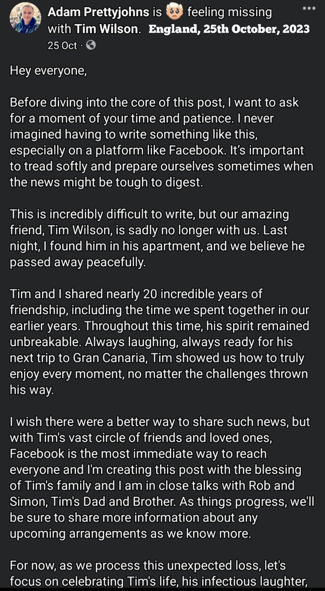 England, Tim Wilson. #diedsuddenly (Oct 2023) "Tim Wilson, is sadly no longer with us. Last night, I found him in his apartment, we believe he passed away peacefully. For now, as we process this unexpected loss, let's focus on celebrating Tim's life." #pfizer #nhs #astrazeneca https://t.co/gcyu3ALbja