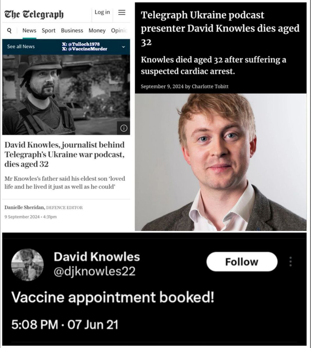 David Knowles, journalist behind Telegraph’s Ukraine: The Latest podcast, #diedsuddenly aged 32 💉 https://www.telegraph.co.uk/news/2024/09/09/david-knowles-journalist-telegraph-dies-ukraine-war-podcast/#:~:text=Mr%20Knowles%2C%2032%2C%20who%20worked,to%20head%20of%20social%20media.