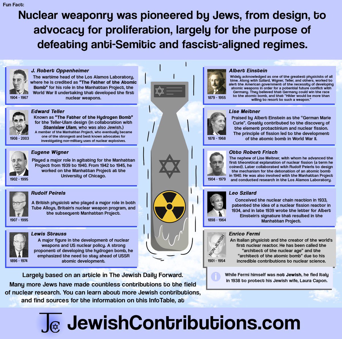 In fact the world owes of most the credit for its advancement towards Armageddon to jews. All of this was part of the Unites States' mad dash to establish nuclear technology before the rest of the world, which we have come to know as the Manhattan Project.