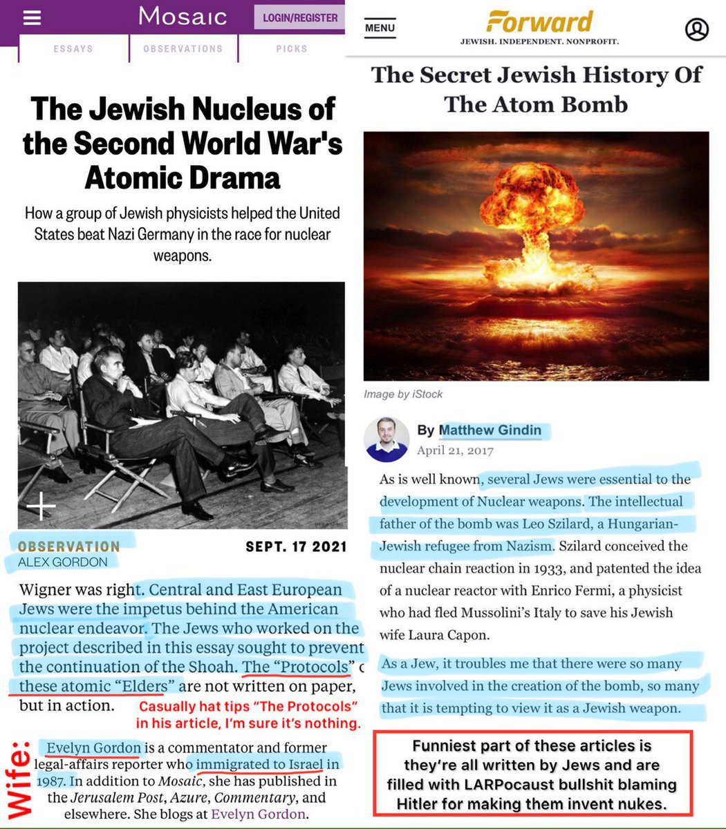 In case you feel like calling me a liar, here are two articles written by jews regarding the nuclear situation. As usual, the eternal victims blame Hitler & the Holobunga for forcing them to make the deadliest weapons in the history of mankind.