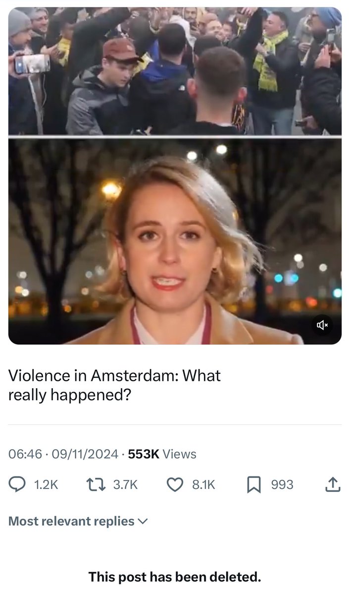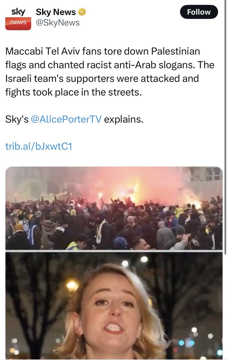 Breaking: @SkyNews just deleted this video by their Amsterdam correspondent @AlicePorterTV posted to Twitter, without public explanation. I saved a copy. The video explains the truth about the Israeli football hooligans who went on a racist rampage in the city this week. Watch: https://t.co/saVATm74FO