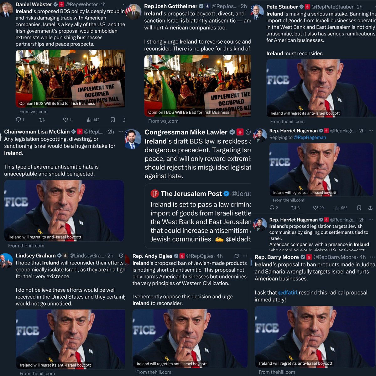 Israel is scared that if Ireland passes a law criminalizing trade with Israeli settlements in the West Bank, other EU countries might follow suit. So to stop that, Israel used its representatives at AIPAC to push US politicians to make posts on X threatening Ireland not to. https://t.co/6gx20iB0Bi