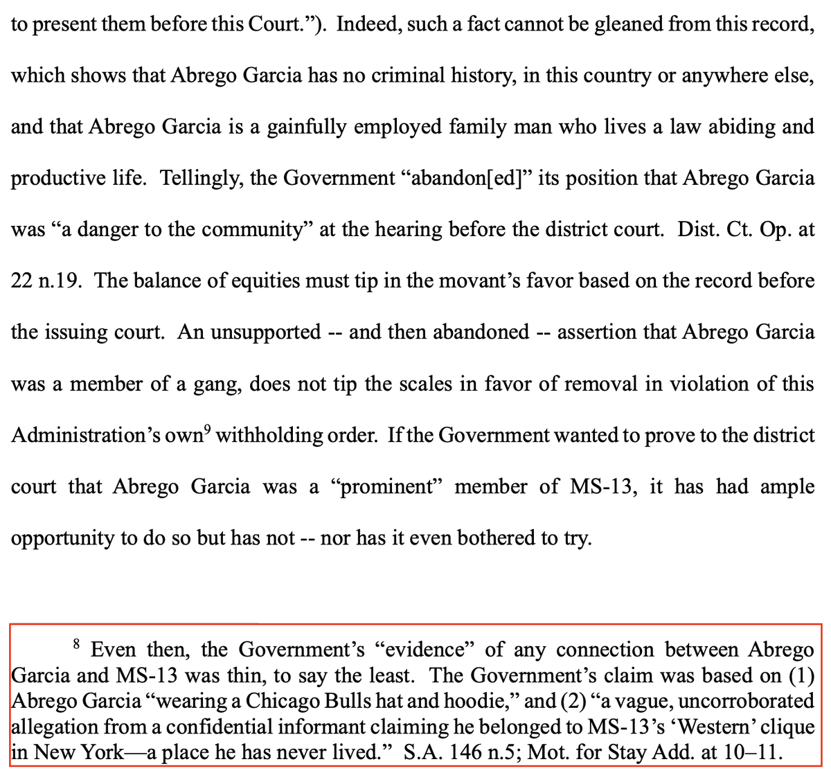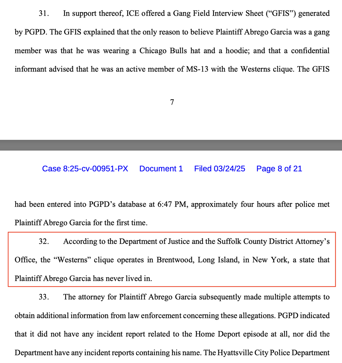 How did Sandoval-Moshenberg deal with this in his complaint? Well, he asserted, without equivocation, that the Westerns Clique of MS-13 "operates in Brentwood Long Island, in New York, a state that Plaintiff Abrego Garcia has never lived in." If true, that would be pretty devastating to the credibility of the confidential informant! And indeed, both Judge Thacker's 4th Circuit opinion and Judge Xinis' district court opinion cite this specific point to discredit the evidence that Abrego-Garcia is in MS-13.