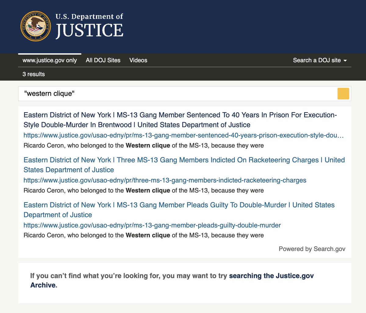 Given how fast and loose Sandoval-Moshenberg played with the GFIS, I decided to try and find the basis for his claim that the DOJ said the Westerns Clique only operates in New York. When you search "Western Clique" on DOJ's website, all that comes up is one particular MS-13 double murder. But there's no claim by DOJ here that the Western Clique only operates in Long Island - it just says that two particular members of the Western Clique were murdered in Long Island. But there's more...