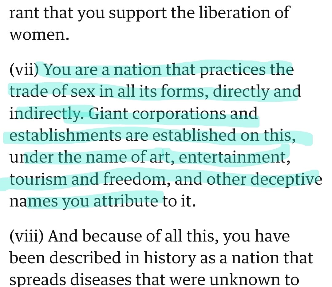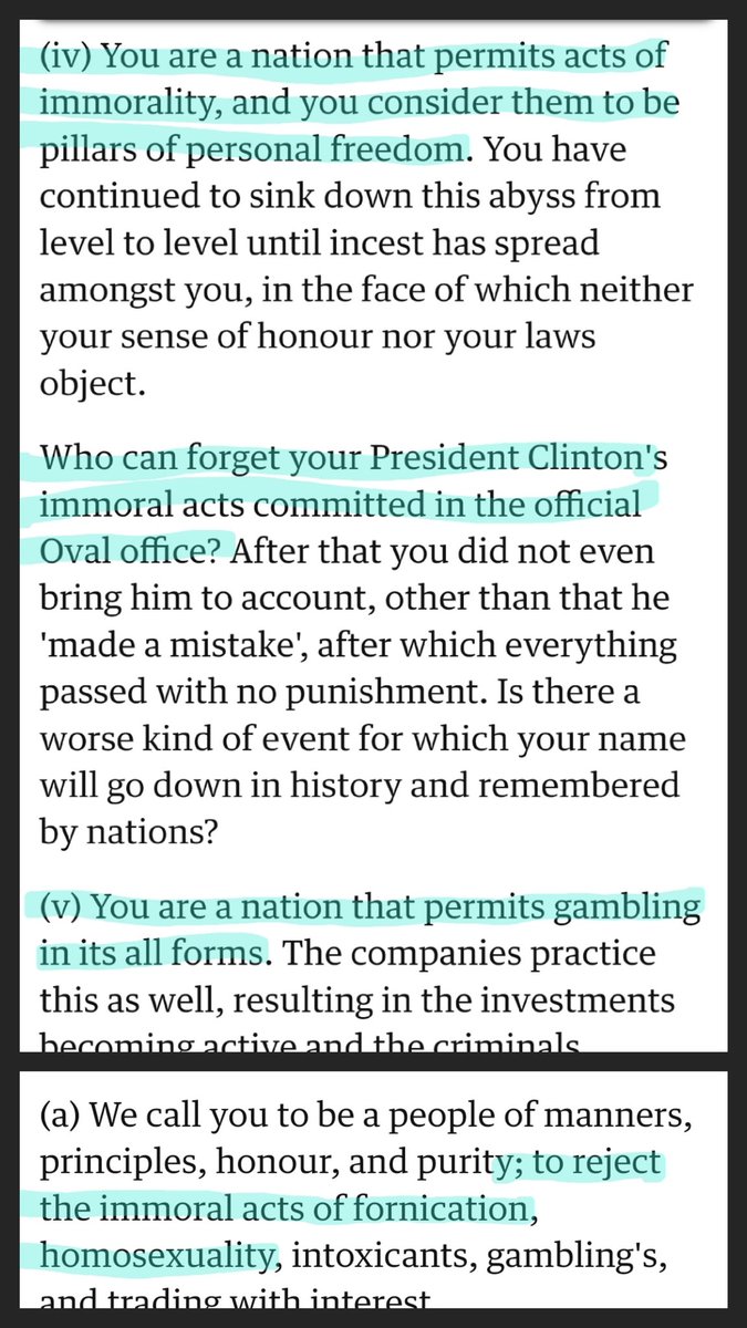 2/ The writer adopts a brilliant strategy: using the ideas of American moralists (both left and right) to attack America's moral authority. The goal is to use moral complaints that he knows will resonate with Americans in order the undercut America's moral goodness.