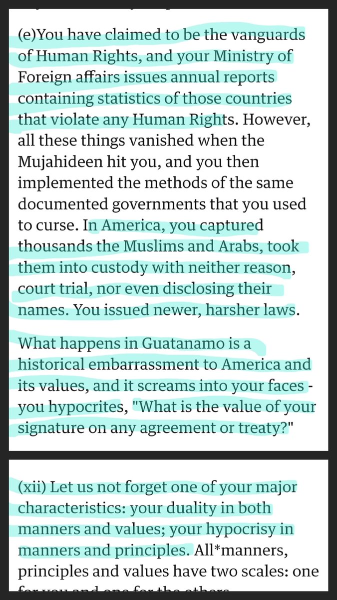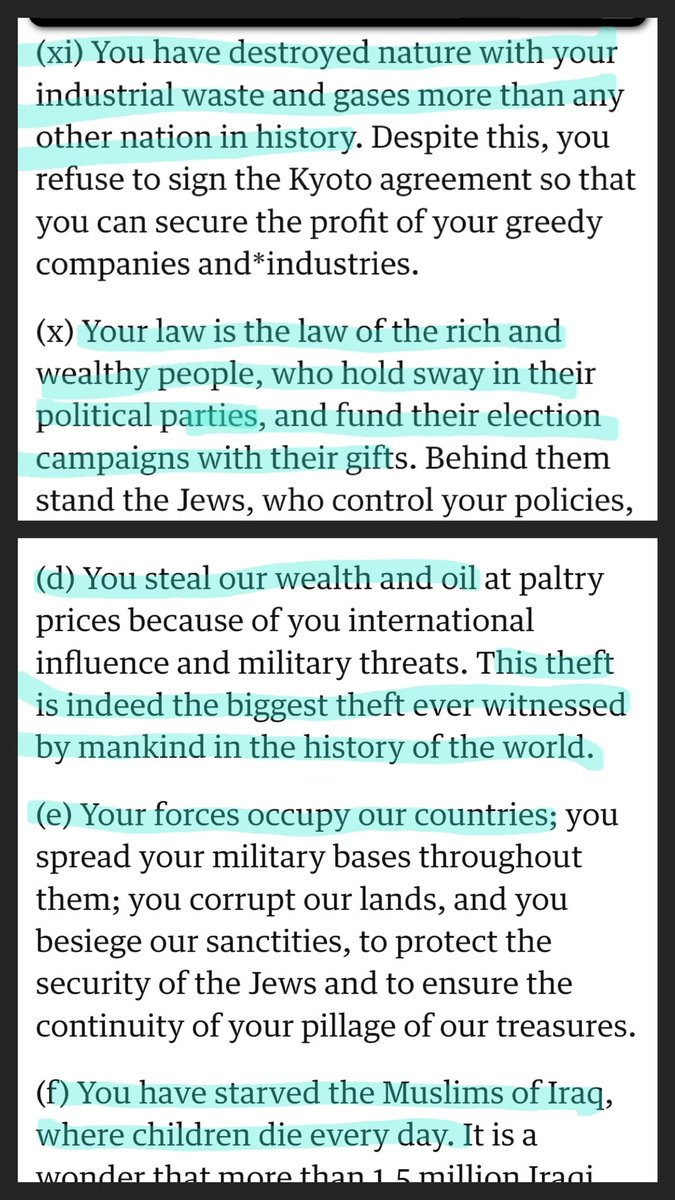 1/ The letter @yashar is talking about here is attributed to Osama Bin Landen, and it is a masterpiece of political propaganda. Maybe the best example of propoganda that I have ever seen. Let's go through it so we can see what's happening here /🧵 https://web.archive.org/web/20231115091400/http://www.theguardian.com/world/2002/nov/24/theobserver…
