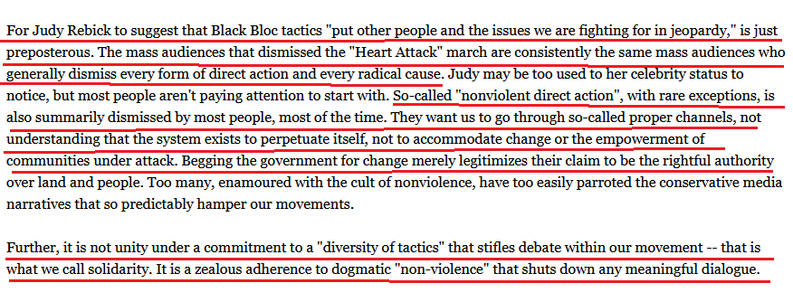 13/ Alex Hundert defended "a diversity of tactics" which is a euphemism for allowing violence at protests. Hundert explicitly states a commitment to non-violence is "dogmatic" and "stifles debate" about which tactics to use. Violence is part of the strategy as we will see... https://t.co/jhqyLZBcxj