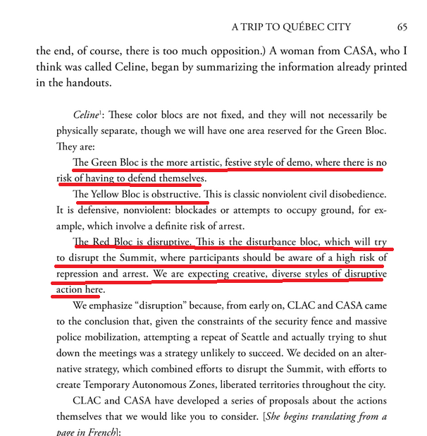 15/ These tactics are not new. David Graeber explains that in 2000, protestors at the Summit of the Americas had Green, Yellow, and Red zones of protest. Each color represented a level of violence allowed. Green was non-violent, Yellow was "obstructive," red was "disruptive". https://t.co/V0tbn8CdIu