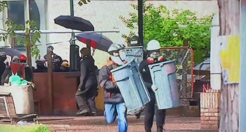4/ In 2020 these shields were brought in and distributed to rioters in organized drops (video 1) In LA we see the same strategy. They hand out protective equipment to rioters (pic 2) who then use them in their attacks (pic 3). Note the same home depot bucket in pics 2 and 3