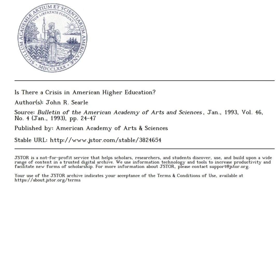 @realchrisrufo @RIKKISCHLOTT @glukianoff @Yascha_Mounk @ConceptualJames @HPluckrose @JonHaidt 11/ Searle put forward an answer in 1971, but I'm not sure that is programme for university reform would be very effective today. Things are much worse, and I think a much stronger medicine is needed. The question remains "what do we do?" I am open to suggestions. /fin