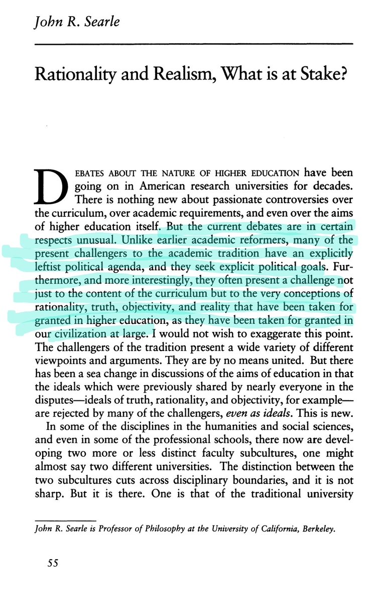 3/ Searle also pointed out that the result of this is "unthinking left wing orthodoxy" by people who see their role in the university as being to carry out a left wing political agenda. And we are now seeing the fruit of this on university campuses and in the larger society. https://t.co/xh8oEucVCW