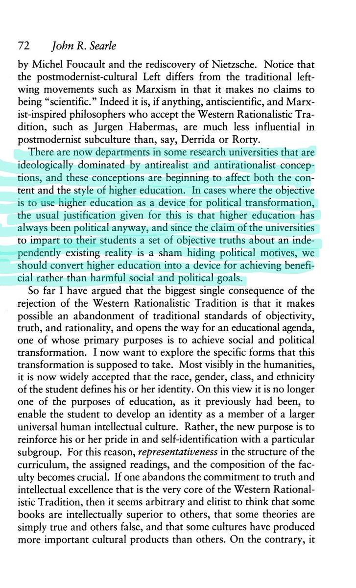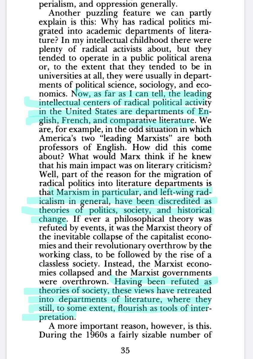 4/ 1993 Searle pointed out that Marxism was "refuted by events" which had discredited it. So m Marxism retreated to literature departments where people who wanted to use culture as an instrument for "social change" (AKA advancing leftist ideology) used it as an interpretive lens. https://t.co/w1OrNQHJU7