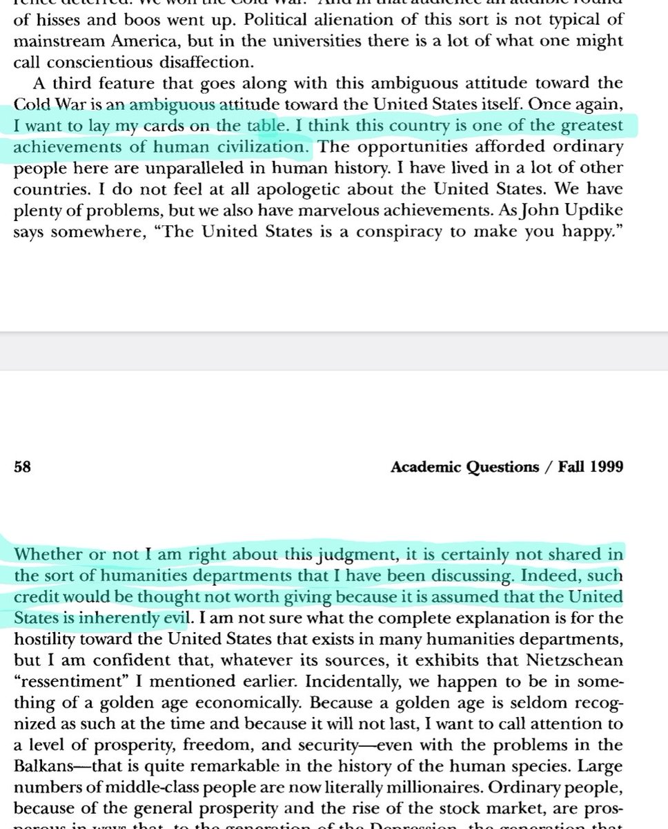 2/ As John Searle pointed out in 1999, in the humanities departments of our most prestigious universities the dominant view is that the United States is inherently evil. And this is what they teach the next generation of professors, lawyers, teachers, and political leaders. https://t.co/elaphyC6GK