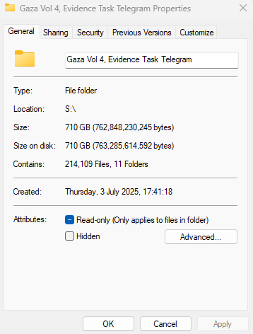 Update: Here is a link to 710 GB of Gaza genocide footage, sourced mainly from Telegram by the group 'Evidence Task'. The entire archive has been submitted to the ICC today. It includes: 169704 images 44049 videos 178 HTML files to browse through it all Special thanks to the team at EvidenceTask for their methodical work recording this footage, this is one of the most complete archives we have found on the web. Warning ⚠️ This footage is extremely graphic, even more than our previous archvies. Handle with caution. It is being shared to document an ongoing genocide. Link: https://drive.proton.me/urls/P9ZFG94DT4#pQOAuw22o7ct Torrent Link: Will be posted tomorrow in comments. Follow our backup: @ZionismExposedx @owenjonesjourno @shaunking @joshuabbazzle @EyesOnSouth1 @RecTheRegime @SuppressedNws @propandco @Kahlissee @ryangrim @RyanMattaMedia