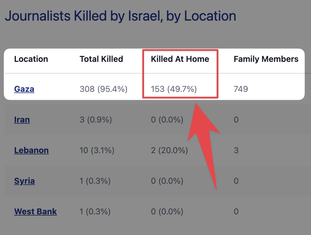 This statistic is unique in human history. Israel has killed more journalists than ww1, ww2, Vietnam, Iraq, Afghanistan, and Libya wars combined.