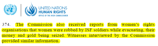 more from the UN Human Rights Council report: "A male witness told the Commission about sexual abuse and harassment of women in Salah al-Din Street during evacuations; where ISF instructed women to undress, leaving them in their underwear. The witness saw several of his female relatives being forced to undress leaving them in their underwear with no veil to cover their hair. He also saw several women being subjected to sexual harassment by the soldiers while stripped, including a girl about the age of 17 or 18. The soldiers mock ed and harassed the men for not being able to intervene in the forced stripping of women. The witness also saw the mistreatment and arrest of a pregnant women before she was taken away by soldiers."