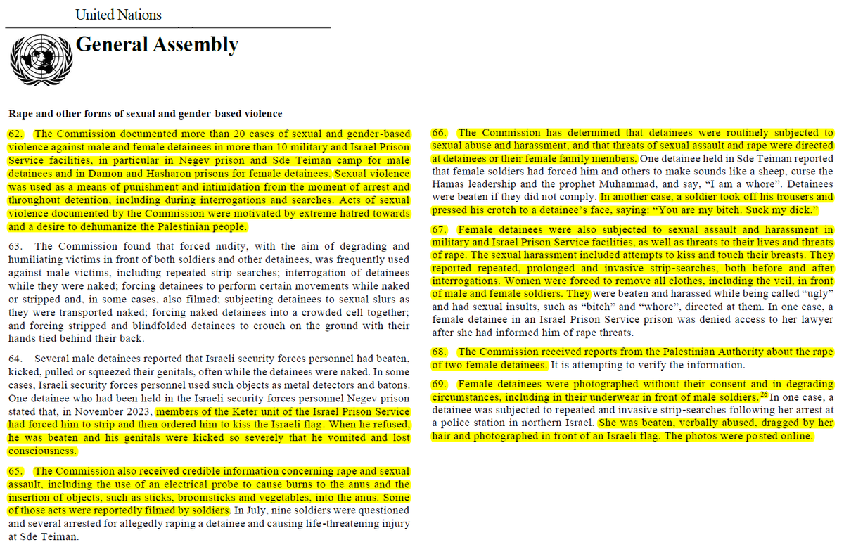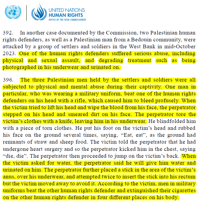 more from the UN Human Rights Commission on the targeted, intentional, systematic Israeli sexualized torture, mutilation and rape of Palestinians: "One of the human rights defenders suffered serious abuse, including physical and sexual assault, and degrading treatment such as being photographed in his underwear and urinated on." "The three Palestinian men held by the settlers and soldiers were all subjected to physical and mental abuse during their captivity. One man in particular, who was wearing a military uniform, beat one of the human rights defenders on his head with a rifle, which caused him to bleed profusely. When the victim tried to lift his head and wipe the blood from his face, the perpetrator stepped on his head and smeared dirt on his face. The perpetrator tore the victimβs clothes with a knife, leaving him in his underwear. He blindfolded him with a piece of torn clothes. He put his foot on the victimβs head and rubbed his face on the ground several times, saying, βEat, eatβ, as the ground had remnants of straw and sheep food. "When the victim asked for water, the perpetrator said he will give him water and urinated on him. The perpetrator further placed a stick in the area of the victimβs anus, over his underwear, and attempted twice to insert the stick into his rectum but the victim moved away to avoid it. According to the victim, men in military uniforms beat the other human rights defender and extinguished their cigarettes on the other human rights defender in four different places on his body."