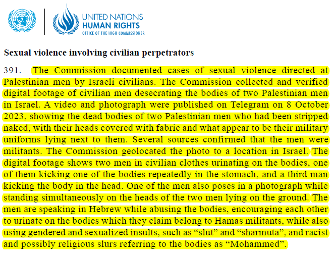more from the UN Human Rights Council report detailing the targeted Israeli sexualized desecration and mutilation of Palestinian bodies, including by Israeli civilians: "The Commission documented cases of sexual violence directed at Palestinian men by Israeli civilians. The Commission collected and verified digital footage of civilian men desecrating the bodies of two Palestinian men in Israel." "A video and photograph were published on Telegram on 8 October 2023, showing the dead bodies of two Palestinian men who had been stripped naked, with their heads covered with fabric and what appear to be their military uniforms lying next to them." "The digital footage shows two men in civilian clothes urinating on the bodies, one of them kicking one of the bodies repeatedly in the stomach, and a third man kicking the body in the head. One of the men also poses in a photograph while standing simultaneously on the heads of the two men lying on the ground. "The men are speaking in Hebrew while abusing the bodies, encouraging each other to urinate on the bodies which they claim belong to Hamas militants, while also using gendered and sexualized insults, such as βslutβ and βsharmutaβ, and racist and possibly religious slurs referring to the bodies as βMohammedβ."