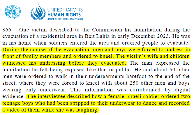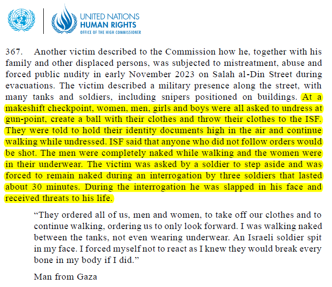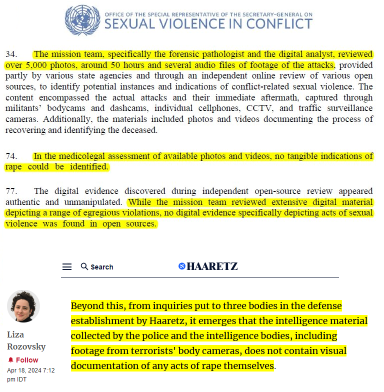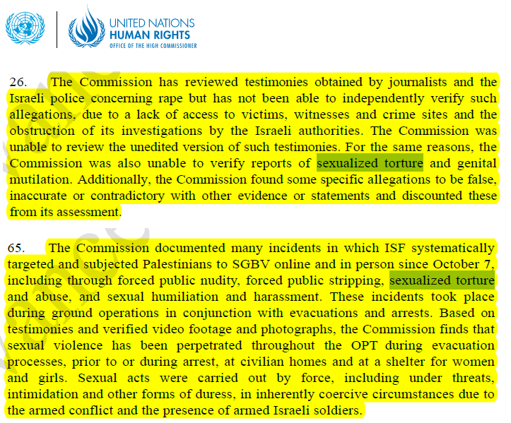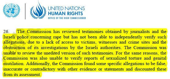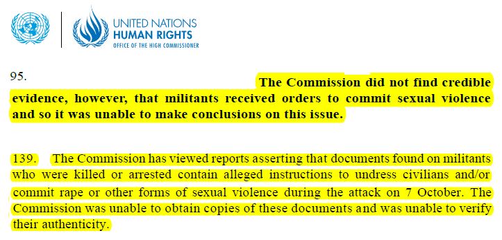 just as in multiple places in the same UN Human Rights Council report it explicitly says it didn't find evidence of a planned, systematic, ordered Hamas campaign of sexual violence. Remember this is the core of the "mass rape" hoax fabricated and spread by the Western media class https://t.co/oAfO87JIb4