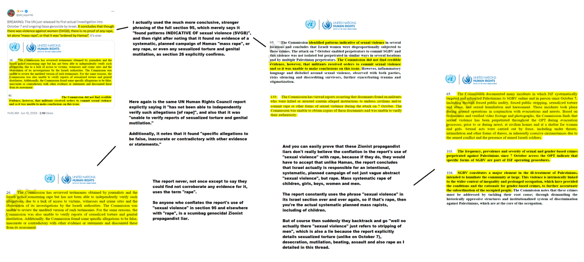 Now this is important, and it goes to the full section 95 and its use of the phrase "patterns indicative of sexual violence" which Zionist propagandists are intentionally and very easily provably lying about, both about the content itself, and what I said about it in my initial thread on the Human Rights Council report. Again, as I said in my initial thread, the report does say that there was, to use its own careful language which propagandist scum are of course intentionally obfuscating, "patterns indicative of sexual violence (SGBV) in several locations", in section 95 and elsewhere. Read again: Not conclusive proof, but "patterns indicative of", immediately followed by saying they did not corroborate the claim of a planned, intentional, systematic Hamas campaign of sexual violence, let alone rape. In fact, it says they also could not corroborate any instance of "sexualized torture" or "genital mutilation", the former of which they do cite in the Israeli case against Palestinians. Ironically in my initial thread on the UN Human Rights Council report, I did not even include the inconclusive nature of that phrasing, "patterns indicative of". I actually made it much stronger and presented it as conclusive, saying "It concludes that though there was violence against women (SVGB), there is no proof of any rape, let alone "mass rape", or that it was "ordered by Hamas." Now again, the report explicitly says in section 26 it could not corroborate any claims of rape on October 7. Not one. Not a single one. And again, nor any claim of "sexualized torture" or "genital mutilation", the former of which they did corroborate in the Israeli case against Palestinians. So anyone conflating the very careful conditional statement of "patterns indicative of sexual violence" with the "Hamas planned orchestrated systematic mass rape" hoax, is a liar who are trying to bury the actual conclusion of the report, which you can read for yourself in full here, and run the searches for the uses of "sexualized torture" and "rape" in the summary and the full detailed sections on October 7 and sexual violence against Palestinians: https://www.ohchr.org/en/press-releases/2024/06/israeli-authorities-palestinian-armed-groups-are-responsible-war-crimes They are lying to you intentionally, because they are pure propagandist scum. And you can easily prove that they are intentionally lying by doing this conflation but just looking at what I posted in this entire thread detailing the use of term "sexual violence" in relation to Israel and its kidnapping, sexualized torture, mutilation, desecration, abuse, beating and rape of Palestinian babies, girls, boys, women and men. And here you can again tell that they're lying because suddenly they revoke the conflation of "sexual violence" with "mass rape" in the report in the Israeli case, where it actually does conclusively say that they have an intentional, planned, systematic, standard operating procedure of engaging in mass sexual violence, sexualized torture, desecration and mutilation against Palestinian babies, girls, boys, women, men,not just since October 7, but long before. So anyone who says "OMG THE SQUIRREL JUST POSTED THE DIRECTLY REFERENCED SENTENCE OF SECTION 95 THEY EXPLICITLY REFERRED TO WITH REGARD TO NO EVIDENCE OF A HAMAS SYSTEMATICAL INTENTIONAL PLAN OF ANY SEXUAL VIOLENCE LET ALONE RAPE BEING FOUND", with the deranged claim that I intentionally cropped out other parts that somehow contradict it even though I literally added a much stronger conclusive version of it in my post, is lying intentionally to obfuscate, deflect, and ignore what the report actually says.