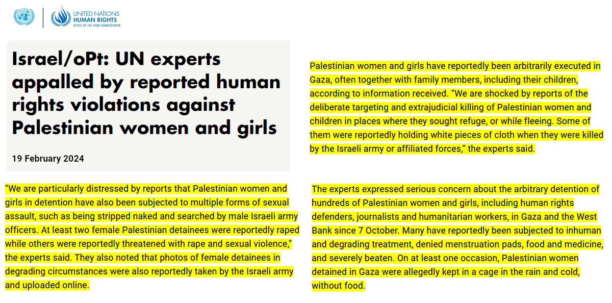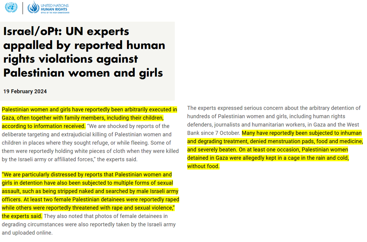 In February, UN Human Rights Council experts said: "At least two female Palestinian detainees were reportedly raped while others were reportedly threatened with rape and sexual violence,β the experts said." "βWe are particularly distressed by reports that Palestinian women and girls in detention have also been subjected to multiple forms of sexual assault, such as being stripped naked and searched by male Israeli army officers." "Many have reportedly been subjected to inhuman and degrading treatment, denied menstruation pads, food and medicine, and severely beaten. On at least one occasion, Palestinian women detained in Gaza were allegedly kept in a cage in the rain and cold, without food." "Palestinian women and girls have reportedly been arbitrarily executed in Gaza, often together with family members, including their children, according to information received."