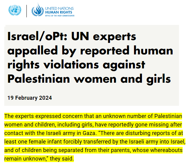 from the same February report by UN Human Rights Council experts: "The experts expressed concern that an unknown number of Palestinian women and children, including girls, have reportedly gone missing after contact with the Israeli army in Gaza. βThere are disturbing reports of at least one female infant forcibly transferred by the Israeli army into Israel, and of children being separated from their parents, whose whereabouts remain unknown,β they said."