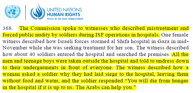 "The Commission spoke to witnesses who described mistreatment and forced public nudity by soldiers during ISF operations in hospitals." "The witness described how a woman asked a soldier why they had laid siege to the hospital, leaving them without food and water, and the soldier responded βYou will die from hunger in the hospital if it is up to us. The Arabs can help you.β