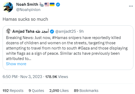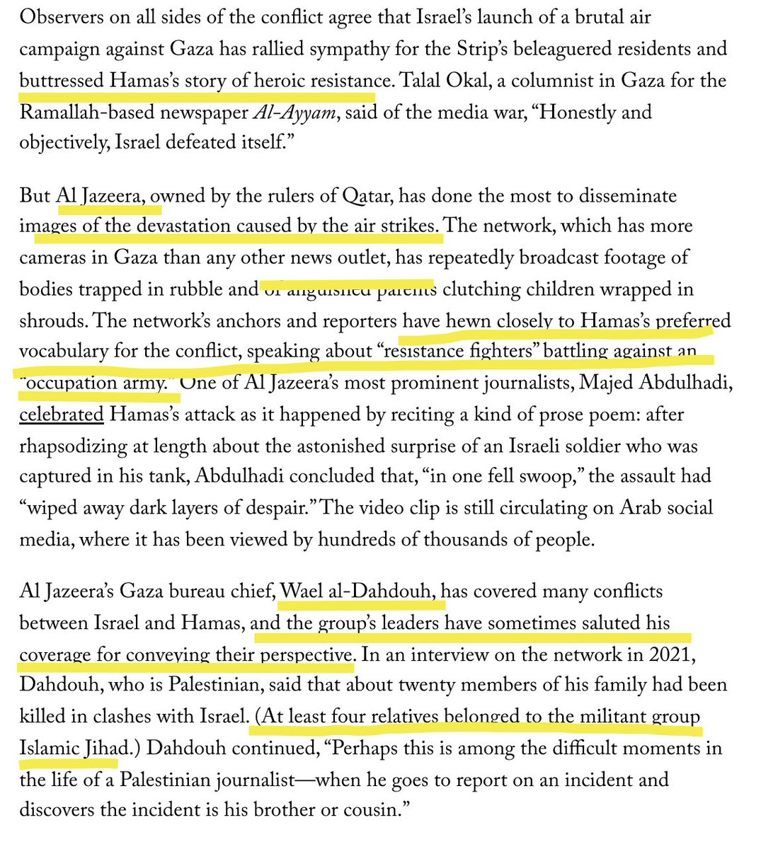 just imagine this. Imagine a reporter at any Western media outlet writes a piece citing an Israeli on October 8 who says: "I blame Netanyahu and the Israeli genocidal occupation for this, they made Hamas do this to us." Their career would be over in 1 millisecond. And that's actually true! That's an empirical fact of reality. But if you say that, even if you put it in the mouth of an Israeli (however rare it is to find one of those), your entire life is immediately ended. You will never find a job again anywhere. Your life is over. But do it in service of laundering an ongoing mass genocidal murder and raping spree on the front page of the New York Times, and you get showered with awards. This is how media operates in the US-NATO empire, also known as the Fourth Reich.